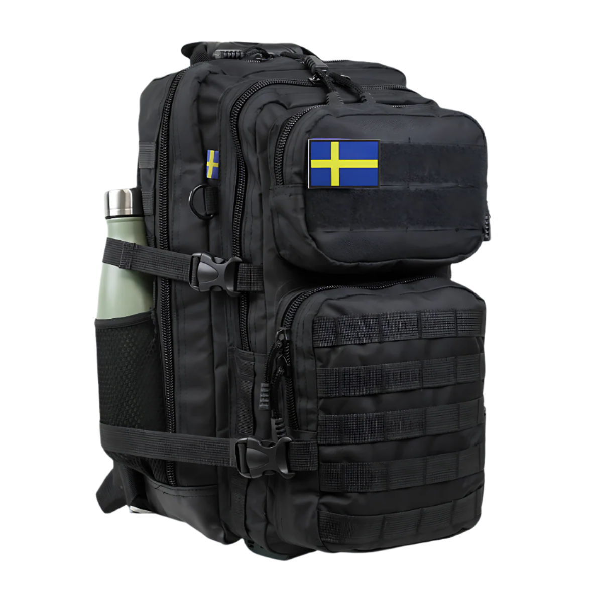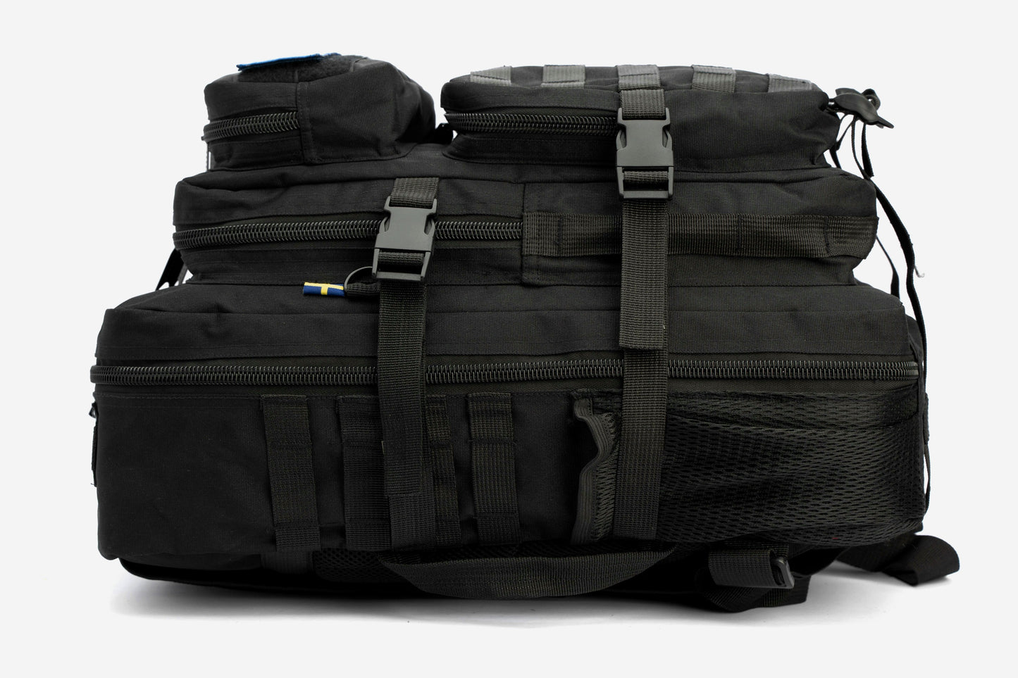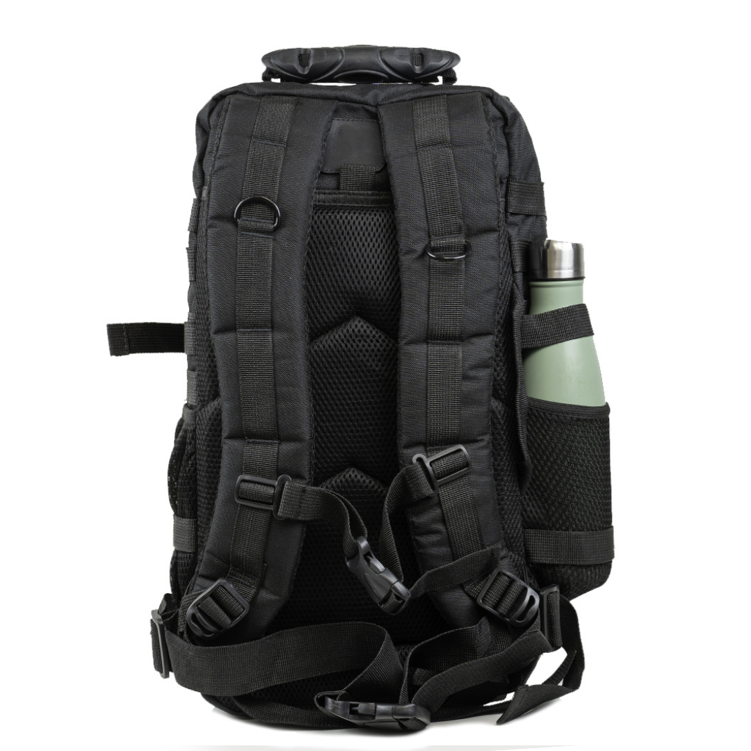 The backpack features a 2-piece compartment system with multiple zippered pockets, including 2 spacious front compartments and an extra mesh pocket for easy organization. With the M.O.L.L.E fastening system, you can expand storage and attach additional gear, making it adaptable to your needs.