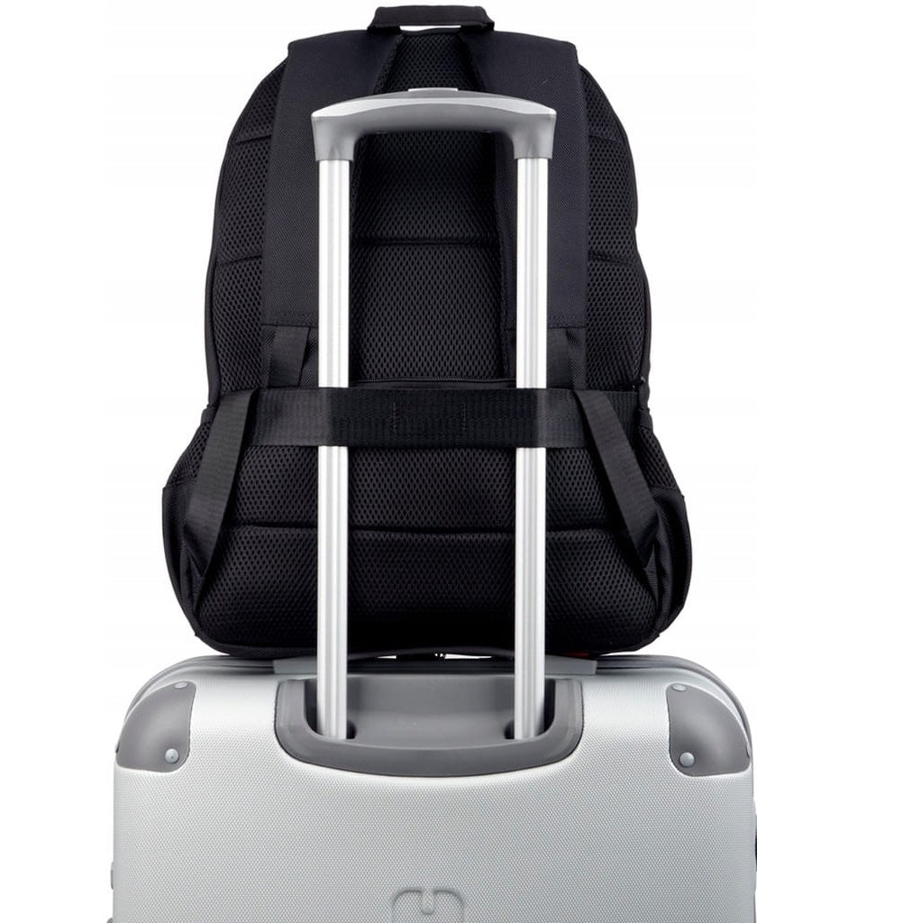 Comfort is guaranteed with padded shoulder straps, breathable back panel, and an adjustable chest strap for better weight distribution. The trolley handle attachment adds convenience during trips.
