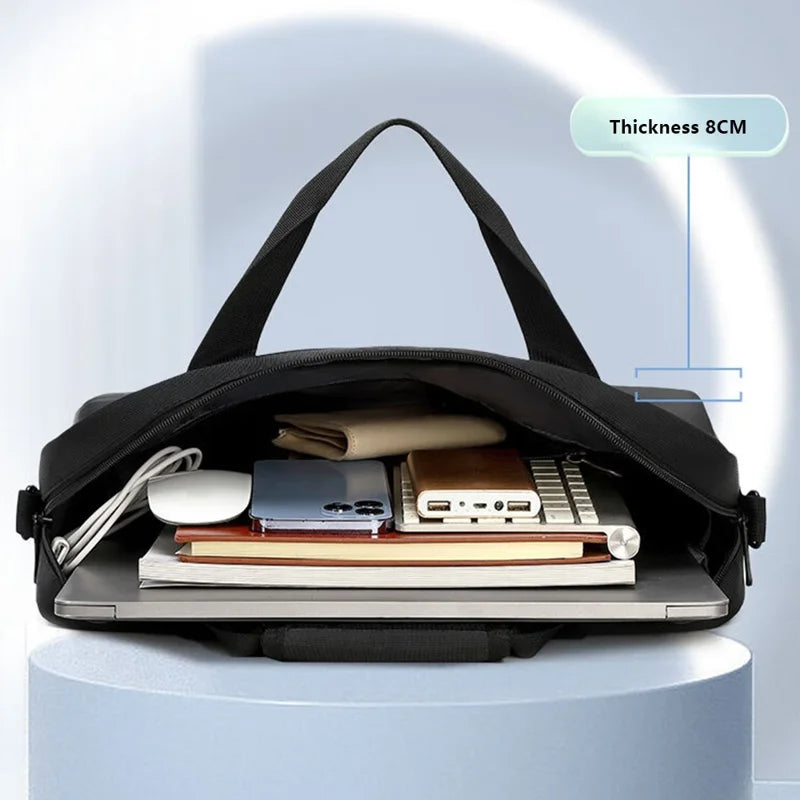 The padded main compartment securely fits laptops up to 15.6 inches, while the spacious interior easily accommodates documents, books, and accessories. A front zippered organizer pocket keeps your phone, charger, and small items neatly arranged and easy to access.