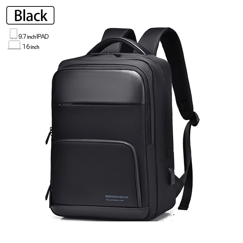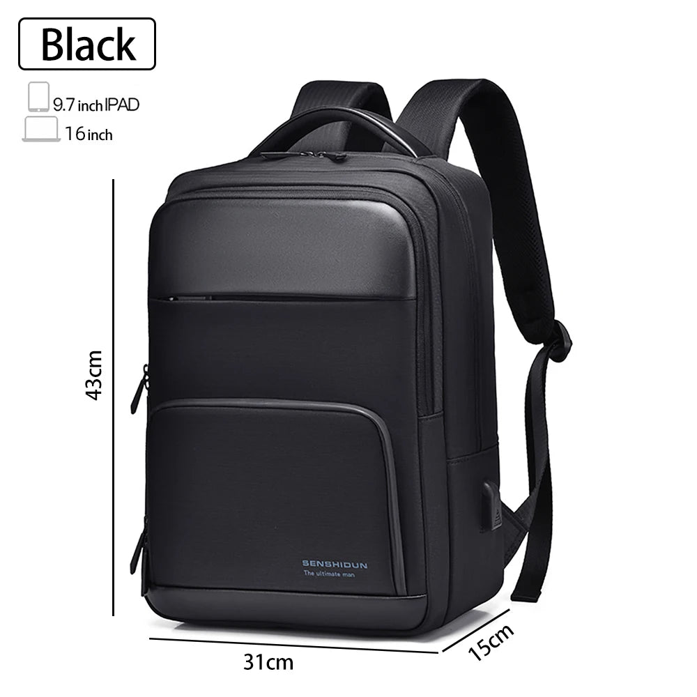 It features a large main compartment with a padded laptop sleeve that fits laptops up to 15.6" or 16", plus multiple front pockets for documents, chargers, and accessories. The integrated USB charging port keeps your devices powered on the go (power bank not included).